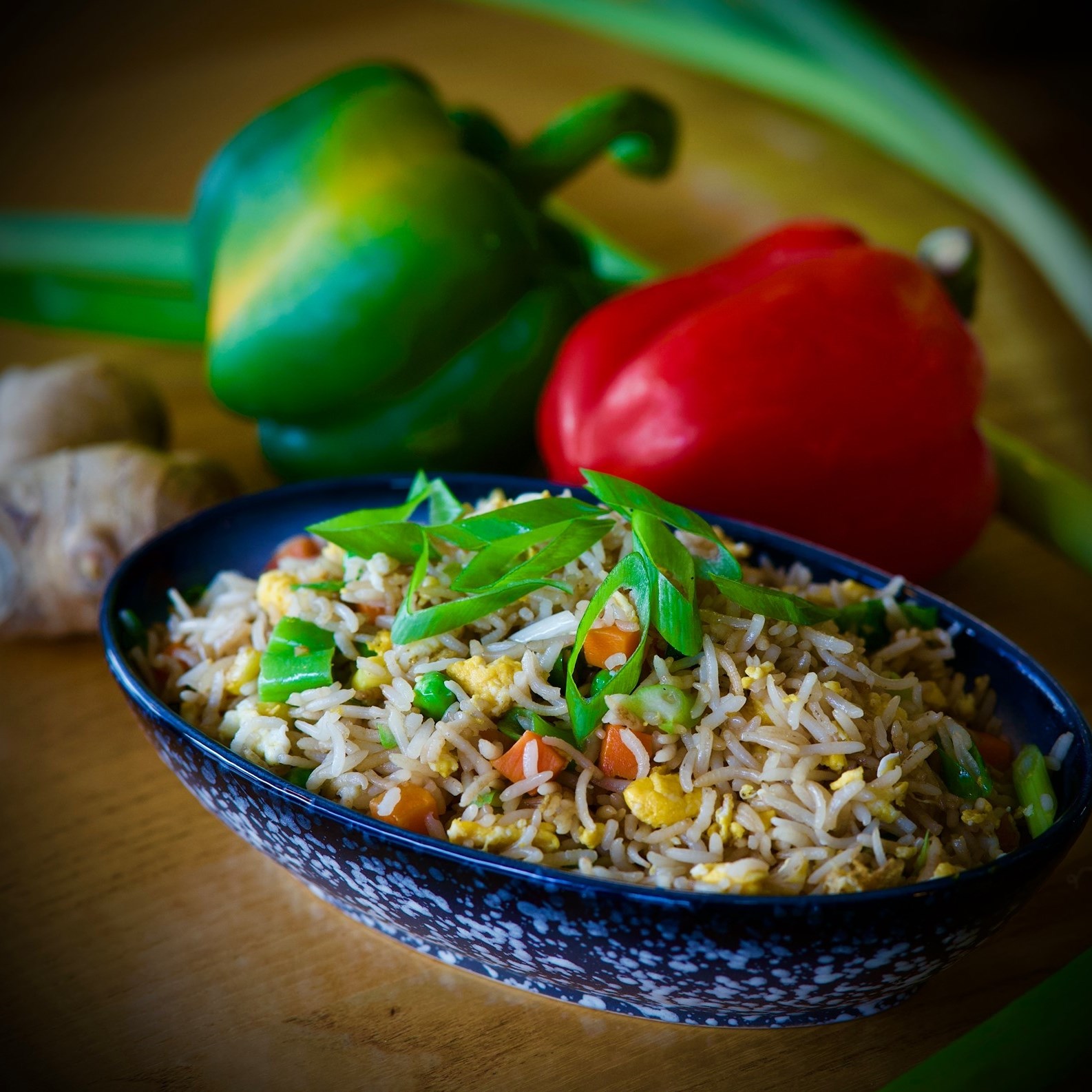 Boiled rice finished in wok with chicken, vegetable, soya sauce and Chinese herbs.